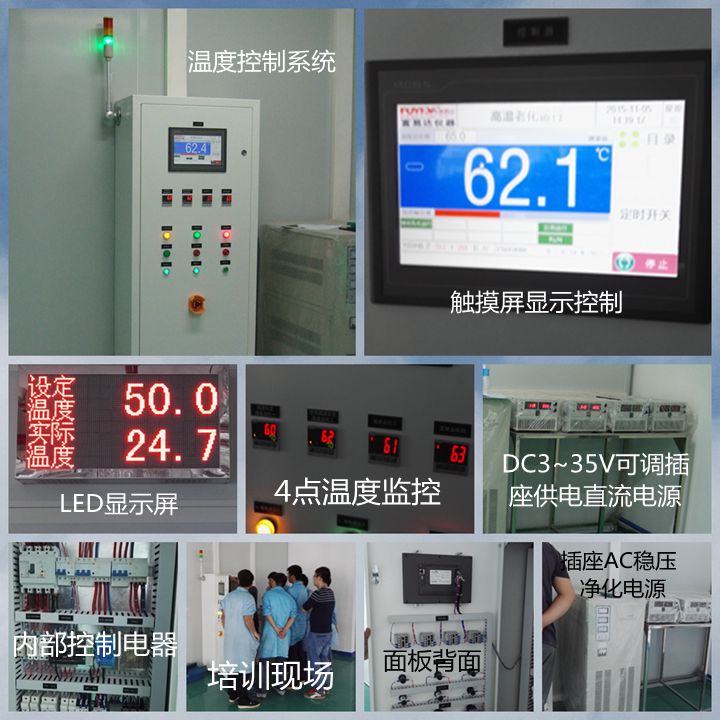 1、采用LED顯示屏,監(jiān)控老化房?jī)?nèi)部溫度; |